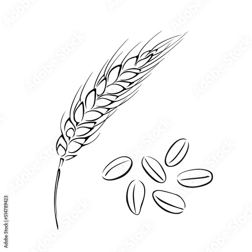 Spikelet of wheat and grain outline. Black and white silhouette of cereals.
