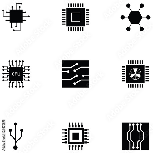 Vector black CPU microprocessor and chips icons set. Electronic chip icons on white background