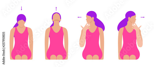 Vector colorful flat illustration. Neck exercises by girl for relax. Pull down your head and fix this. Head back and fix this. Turn head left and right Creative concept. Pink and purple colors.