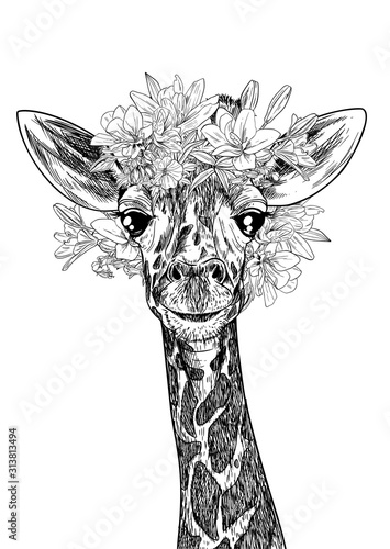Portrait of cute giraffe with flowers on his head