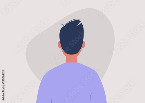 Young male character portrait, back view, millennial lifestyle, flat vector graphics