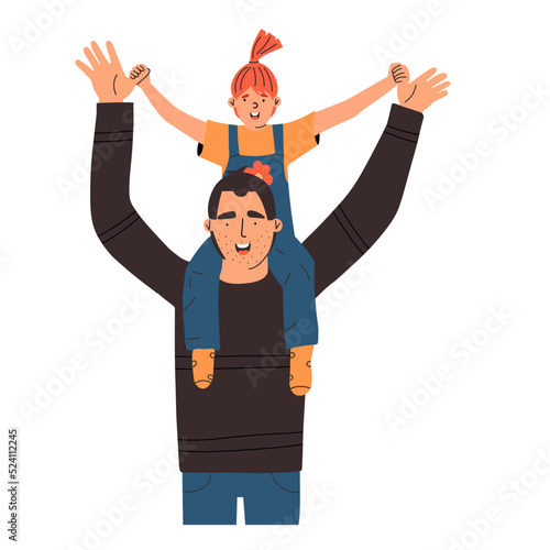 The daughter sits on the father's neck and laughs. The father plays with the child. Happy fatherhood concept. Vector illustration in flat style