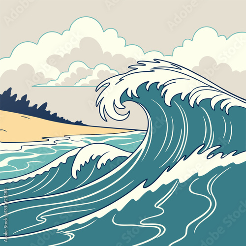 Dramatic Teal Ocean Wave Illustration: Ukiyo-e Style Beach Scene.