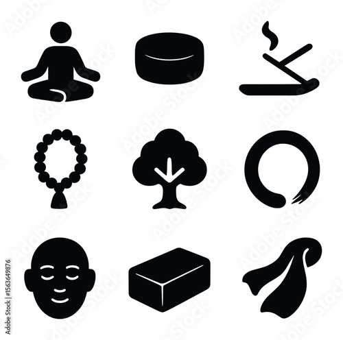 Outdoor Yoga Icons. Solid, filled icons set of outdoor yoga and meditation: lotus pose, meditation cushion,