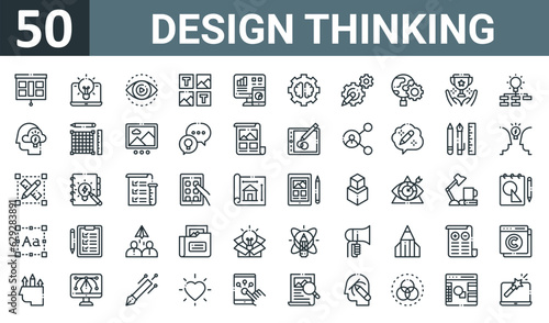 set of 50 outline web design thinking icons such as storyboard, laptop, eye, layout, analytics, think, gears vector thin icons for report, presentation, diagram, web design, mobile app.