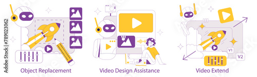 Beautiful female art director consulting with male video editor colleague. They edit video footage using a computer with two screens. Video Editor concept. Trend Modern vector flat illustration
