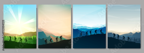 Group hikers walking, trekking with backpacks, outdoor adventure, hiking silhouette, nature exploration, hiking trail, backpacking journey, trekking poles, mountain hiking,