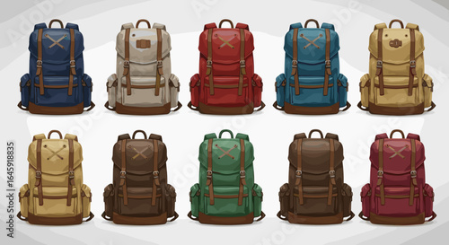 Collection of colorful hiking backpacks and camping gear for outdoor adventures