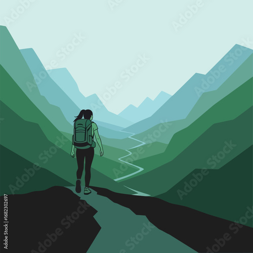 Explore the solitude and introspection of solo hiking in a vector art piece showcasing scenes of individuals trekking alone finding solace and self-reflection amidst nature's vast landscapes .simple