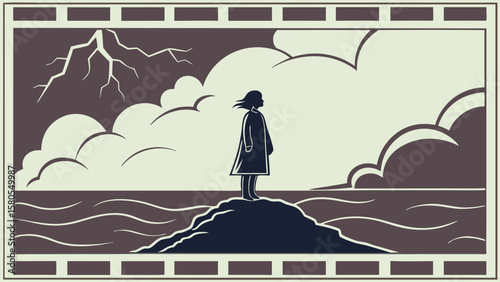 A person standing on the edge of a cliff looking out at a vast and turbulent ocean but remaining calm and centered amid the chaos.. Vector illustration
