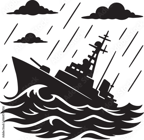 A stylized illustration depicting a warship, possibly a destroyer, navigating through a turbulent sea. The ship is rendered in shades of blue and white, with details suggesting its military