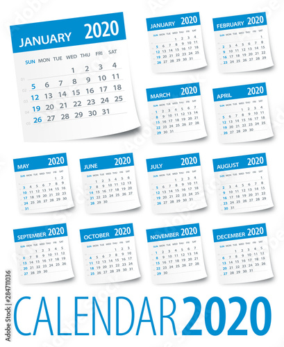 Wall calendar for 2020 year in minimal style with Place for Photo. Week Starts on Sunday. Set of 12 Months.
