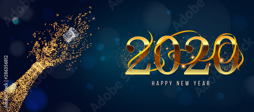 2020 New Year. 2020 Happy New Year greeting card. 2020 Happy New Year background. 2020 Happy New Year background with gold glitter champagne bottle.