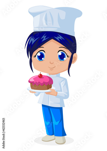 Cute bakery chef girl holding a cake smiling cartoon art illustration logo