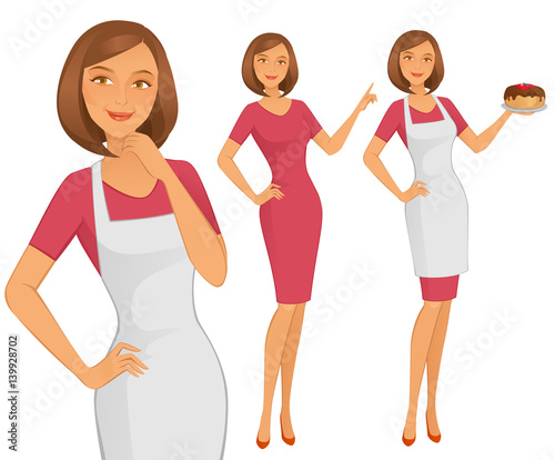 Smiling woman with afro hairstyle in apron standing with different gestures isolated vector illustration