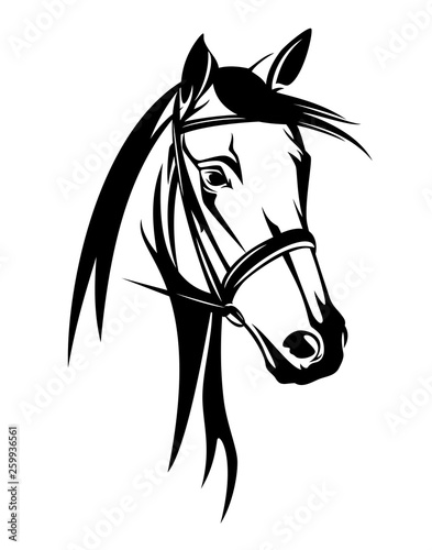 Ornate engraved horse head with bridle in vintage illustration on white background
