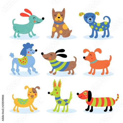 Cute pet dogs in cartoon style. Vector illustration dogs and flowers, rainbows in flat style. Festive summer dog