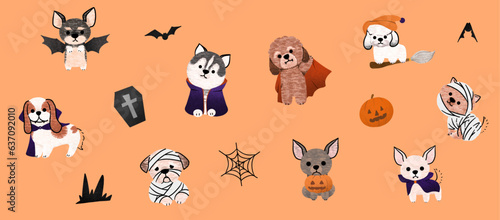 Happy Halloween day lovey pet vector. Cute collection of dogs with halloween costumes, ghost, bat, pumpkin, spider. Adorable animal characters in autumn festival for decoration, prints, cover.