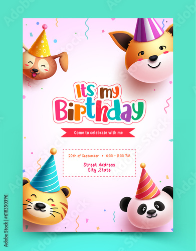 Birthday invitation card vector poster design. Happy birthday kids party celebration with animal cartoon character elements. Vector illustration greeting postcard.