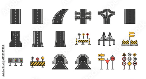 Flat vector icons of bridge and tunnel infrastructure: suspension bridge icon, railway bridge structure, pedestrian overpass, underpass tunnel entrance, drawbridge with control arm, cable-stayed