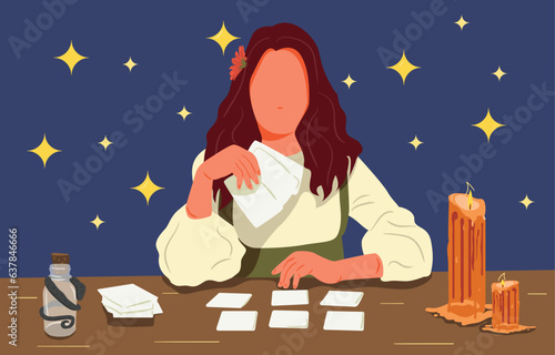 Beauty fortune teller girl. Gypsy oracle. Guessing by tarot cards. Mystic lady. Hand drawn vector illustration