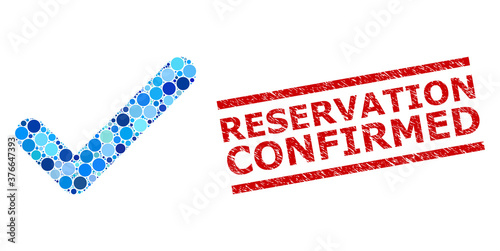 Circle collage ok and RESERVATION CONFIRMED textured stamp seal. Stamp seal includes RESERVATION CONFIRMED caption between parallel lines. Vector mosaic is based on ok symbol,