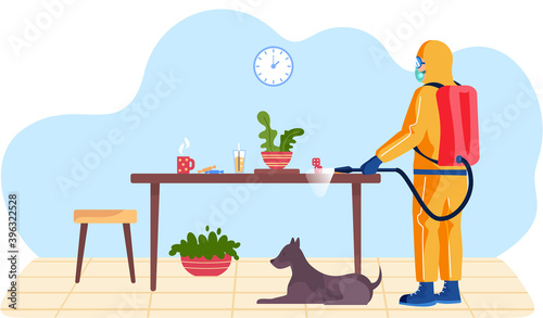 Man in a yellow protective suit disinfects the living room with dog or office with a spray gun. Virus pandemic COVID-19. Prevention against Coronavirus disease, premises sanitization flat vector