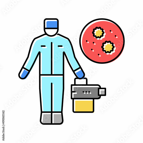 Sanitary treatment of a workplace in an office, treatment of workplaces in beauty salons, removal of bacteria and viruses. Colorful vector illustration.