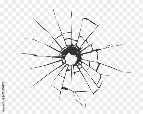 Broken glass, cracks, bullet marks on glass. Illustration set. Glass sheet cracks. Texture glass with black hole on transparent background. You can easy change colors or sizes.  High resolution