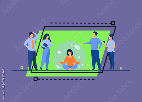 Person keeping social distance and avoiding contact. Woman separating from crowd and meditating in transparent bubble. Vector illustration for solitude or isolation concept