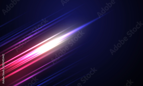 High speed effect motion blur night lights blue and red. Magic shining neon light line trails. Vector speed of light in space on dark background.