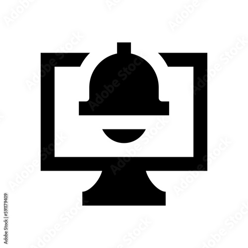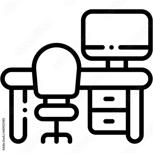 Office worker vector icon isolated on white background. Working place at the table with a laptop. Flat work computer icon