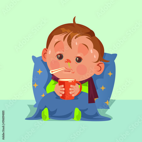 Little boy sick with fever sitting on chair with thermometer in mouth