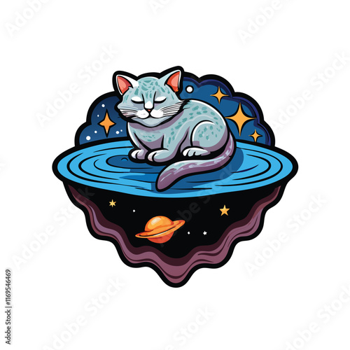 Grey striped cat lying on blue rug with star pattern isolated on white. Fluffy, furry pet resting , Sweet home concept flat cartoon vector illustration