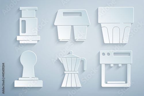 Set line Pour over coffee maker, Aeropress, Coffee machine, Irish, Bag beans, Location with, and paper filter icon. Vector