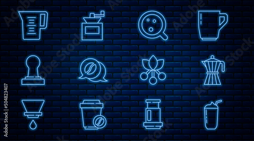 Set line Bag of coffee beans, Aeropress, Jug glass with water, Coffee tamper, cup to go, Location and filter holder icon. Vector