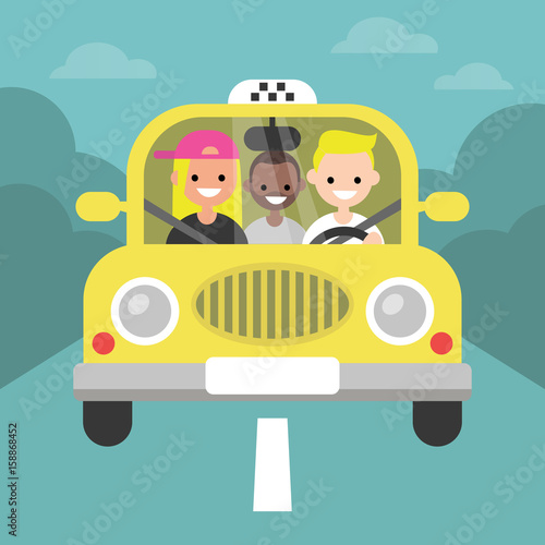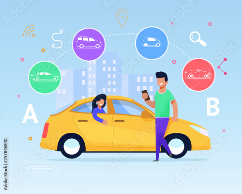 Car share service, carpool, people want carsharing. Vector carpooling or car-sharing, ride-sharing, lift-sharing icon. Multiple drivers on car on rent