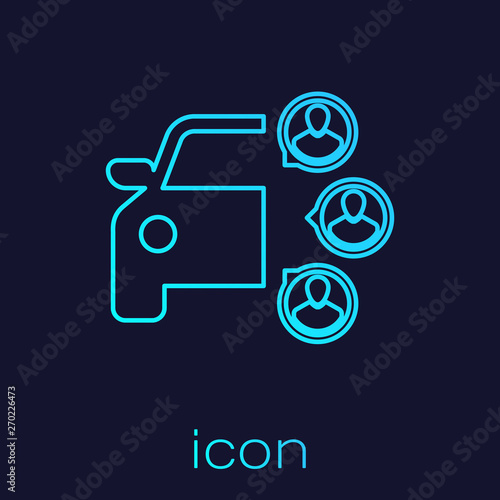 Turquoise Car sharing with group of people line icon isolated on blue background. Carsharing sign. Transport renting service concept. Vector Illustration