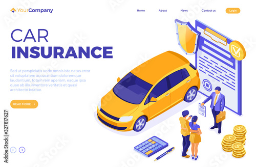 Online service for successful car deal landing page. Family couple children making auto rental, carpool, carsharing agreement paying via e-wallet. Internet automotive showroom digital application