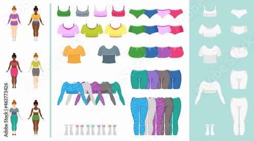 Outfits set in casual style. Women fashion apparels, modern garments looks with accessories. Trendy female wearing for spring and summer. Flat graphic vector illustrations isolated on white background