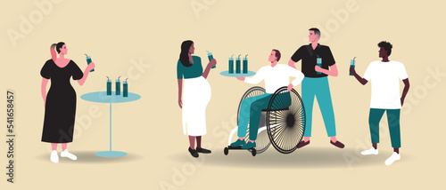 Multicultural party with diverse people isolated, flat vector stock illustration as holiday with cocktails and fun, inclusive people, different gender, ethnic group