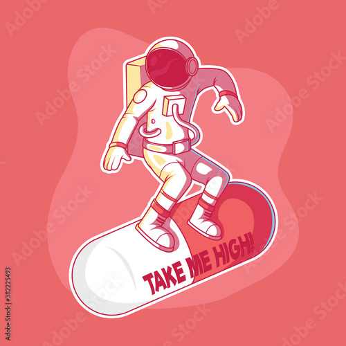 Astronaut surfing on a pill vector illustration. Future, technology, explore, medicine design concept