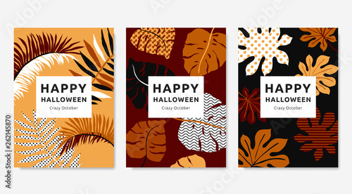 Botanical Halloween greeting card template design, palm leaves, Monstera deliciosa and Fatsia in orange, brown and black tones