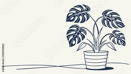 Monstera Deliciosa Line Art: Elegant illustration of a Monstera deliciosa plant in a pot, minimalist line art style. Perfect for home decor, botanical prints.