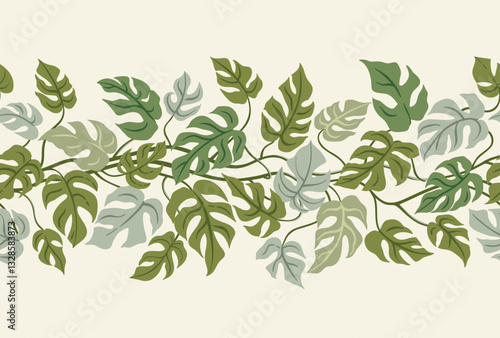 Horizontal  pattern with Monstera deliciosa leaves. Seamless vector floral border