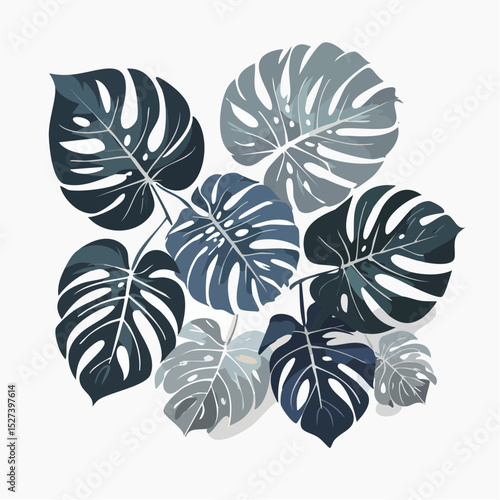 An artistic illustration featuring a collection of stylized Monstera deliciosa leaves in various shades of blue and gray, arranged on a white background.