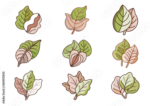 An assortment of vector illustrations showcasing various Monstera deliciosa leaves in diverse shades of green and black, arranged against a plain white backdrop.