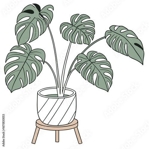 Monstera deliciosa with variegated leaves in a terracotta pot, creating a modern and elegant plant illustration.