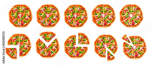 Set of yummy pizzas in cartoon style. Vector illustration of delicious pizzas with different toppings and types of cuts, slices isolated on a white background.