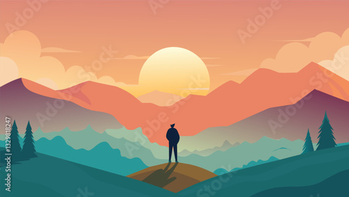 A single person standing on a remote hilltop surrounded by rolling hills and valleys taking in the peaceful sunrise in complete serenity.. Vector illustration